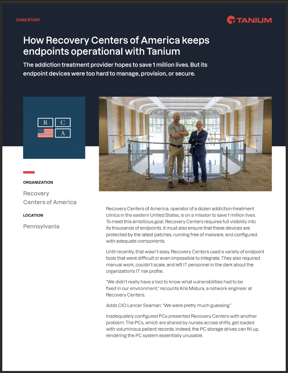 This case study highlights how Recovery Centers of America (RCA), a nationwide provider of addiction treatment services, modernized its IT and security operations to better support patient care. Facing challenges with fragmented tools, limited visibility, and growing cyber risk, RCA implemented Tanium’s platform to gain real-time insight and control across its endpoint environment. The solution […]