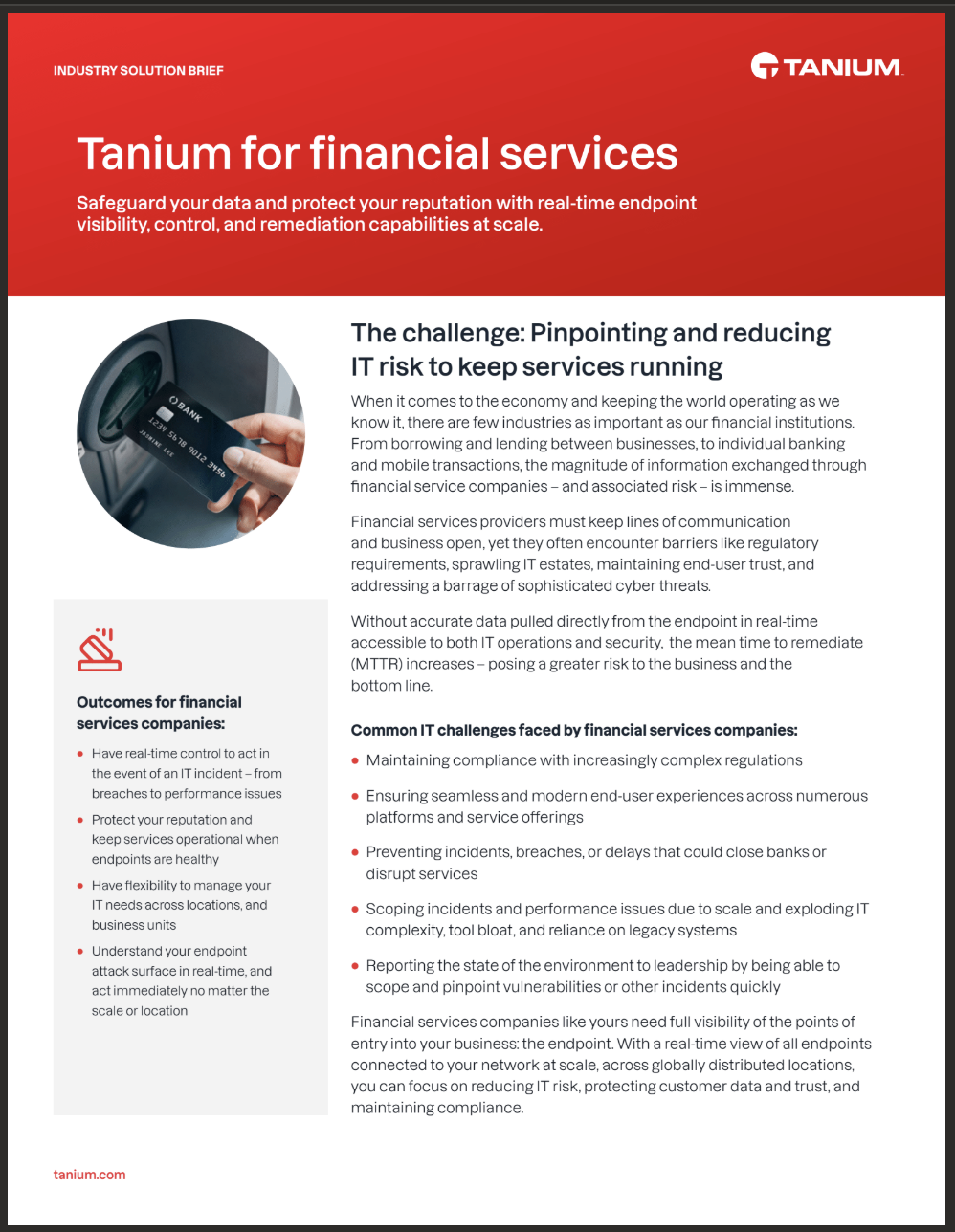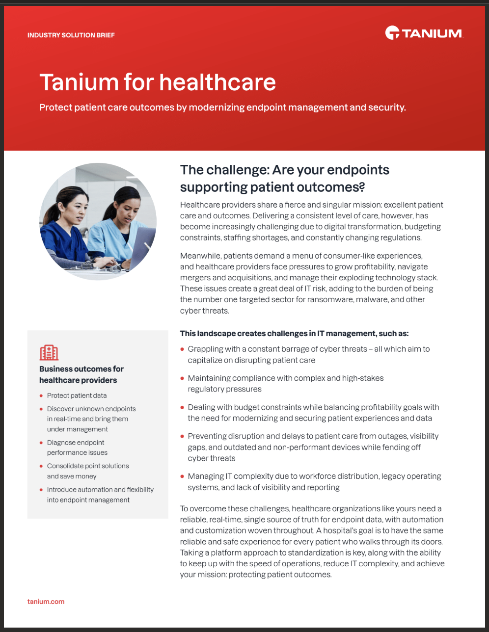 Healthcare organizations face increasing complexity in managing endpoint security, compliance, and operational efficiency. This document highlights how Tanium’s Autonomous Endpoint Management (AEM) platform delivers real-time visibility and control across distributed environments. By unifying IT, security, and risk functions, Tanium enables faster threat detection, streamlined patching, and continuous compliance. The platform reduces operational friction while strengthening […]