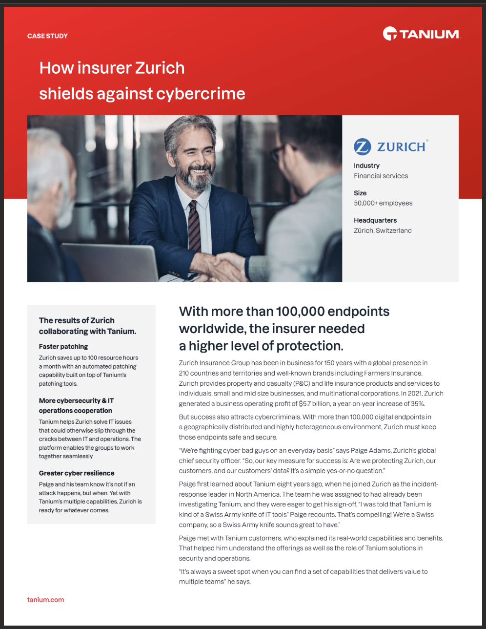 Zurich Insurance Group, a 150‑year‑old global insurer operating in more than 210 countries and territories, manages over 100,000 digital endpoints across a diverse and distributed environment. As cyberthreats grew alongside the company’s business success, Zurich sought a more powerful and unified approach to endpoint visibility, security, and management. Tanium emerged as a transformative solution, offering […]