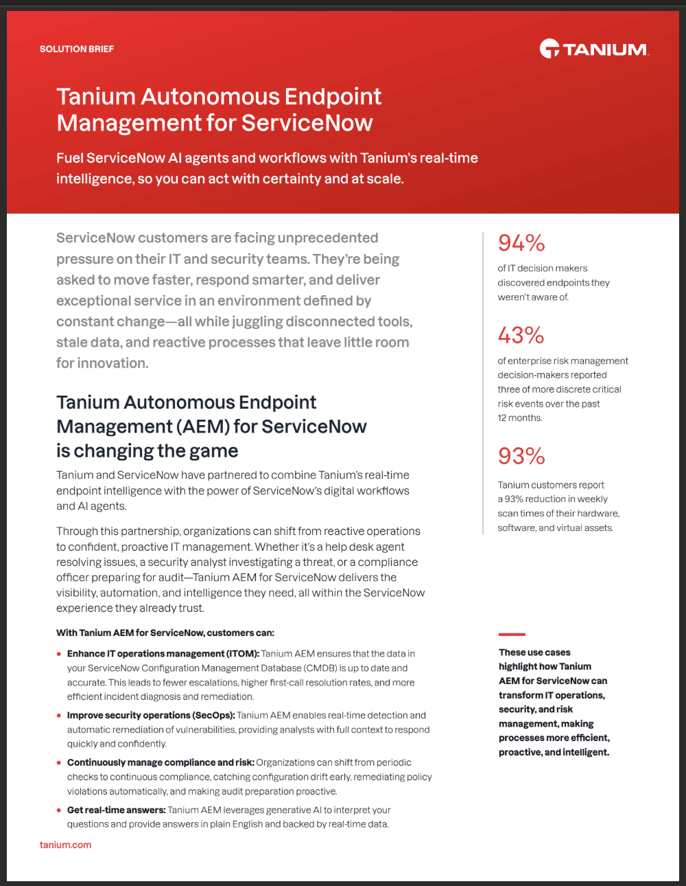 Organizations relying on ServiceNow increasingly struggle with fragmented tools, outdated data, and reactive IT and security processes that slow productivity and elevate risk. Tanium Autonomous Endpoint Management (AEM) for ServiceNow transforms this landscape by combining Tanium’s real‑time endpoint intelligence with ServiceNow’s AI‑driven digital workflows. This integration delivers continuous visibility, automated remediation, and trustworthy, real‑time data […]